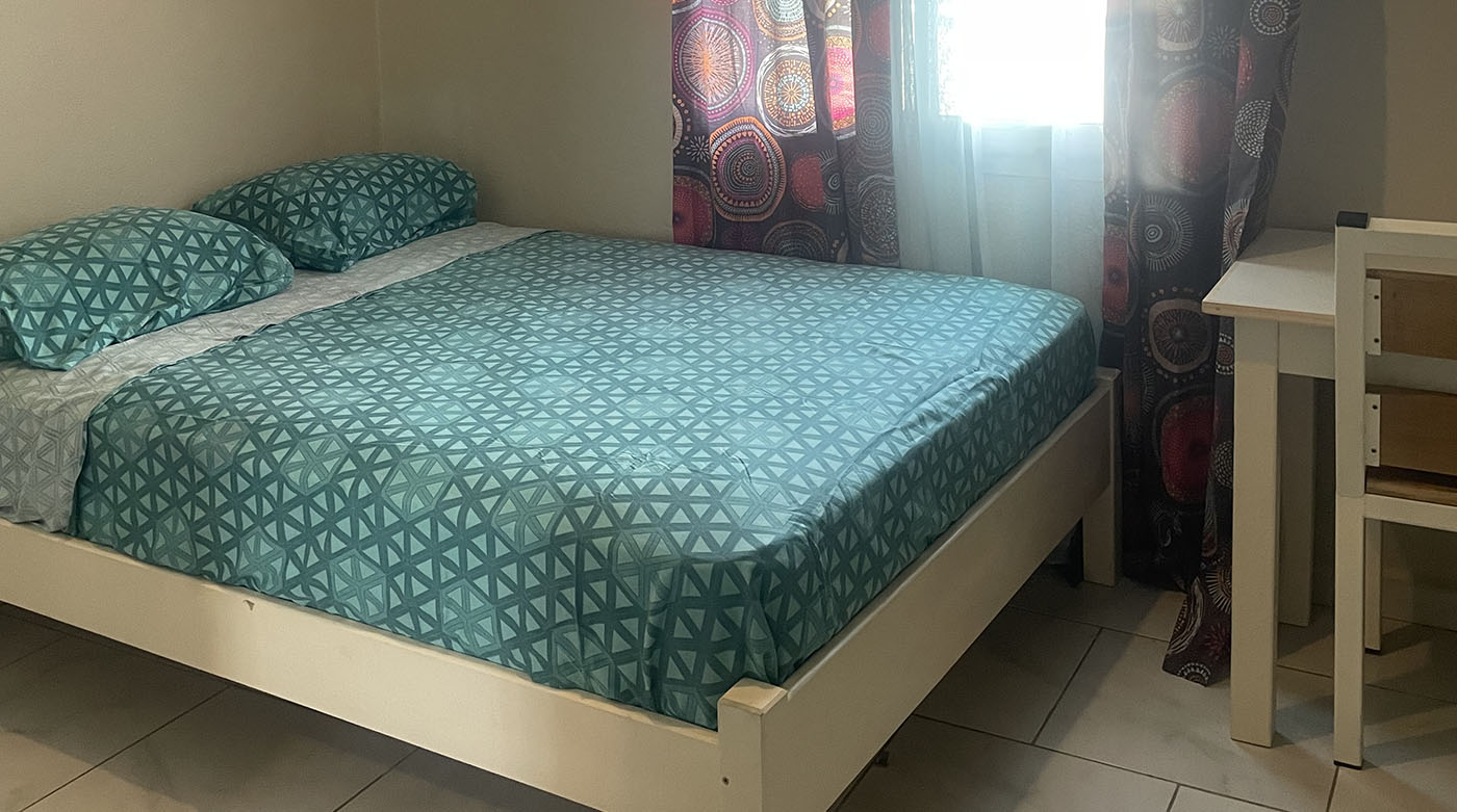 Chambre climatisée avec sanitaires autonomes, équipées d’une table de travail, une petite télévision, et à l’extérieur une terrasse avec u coin détente.